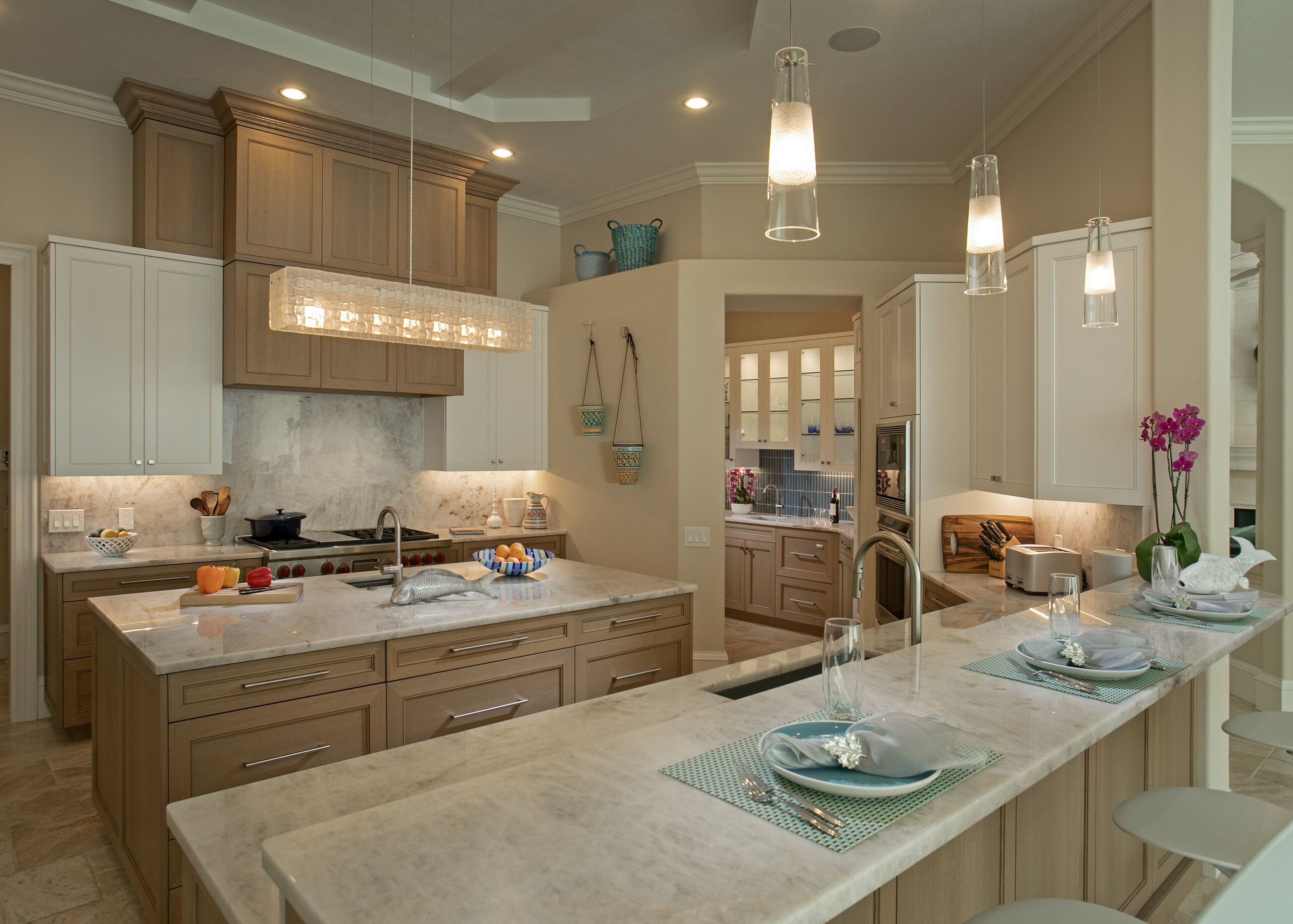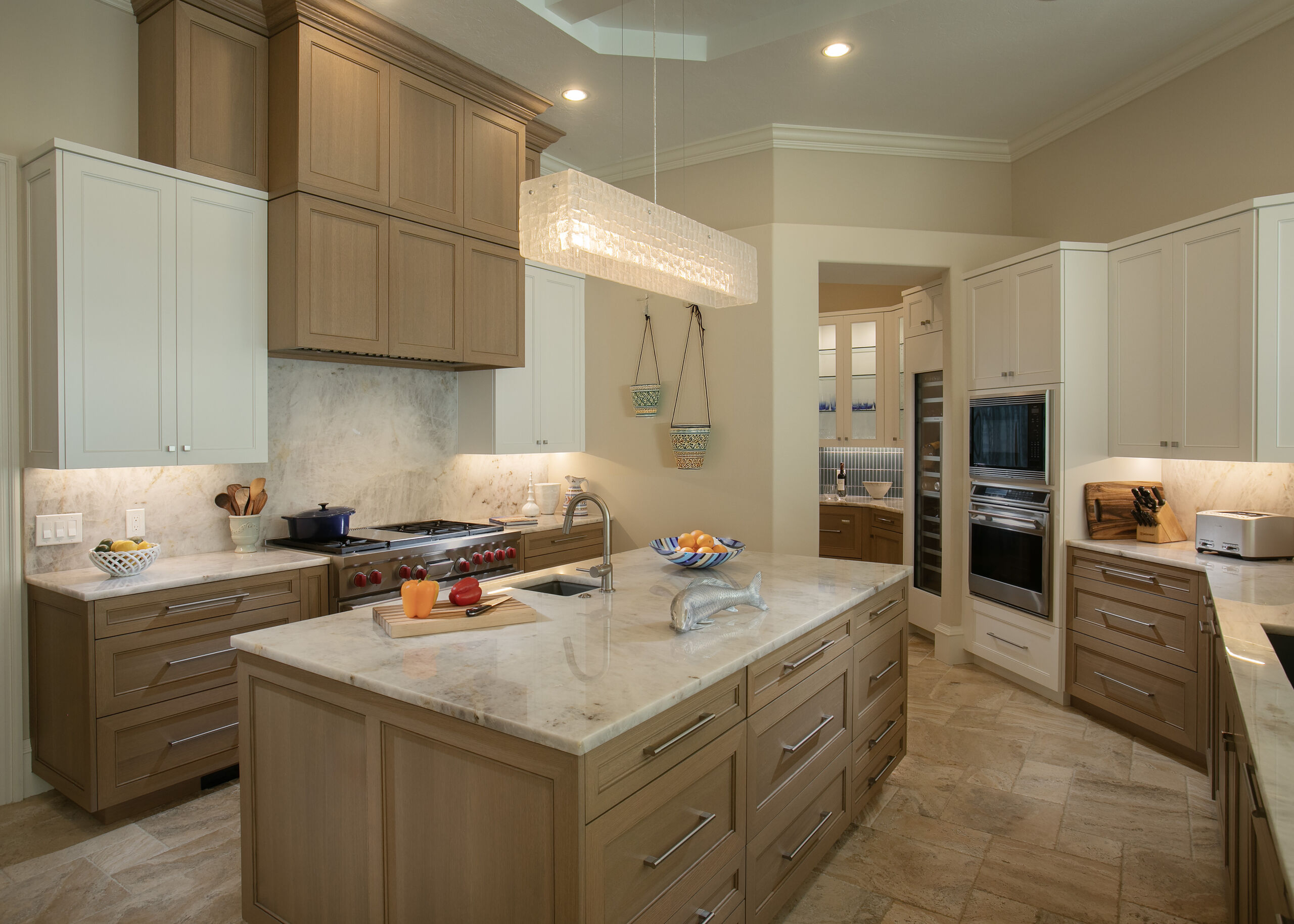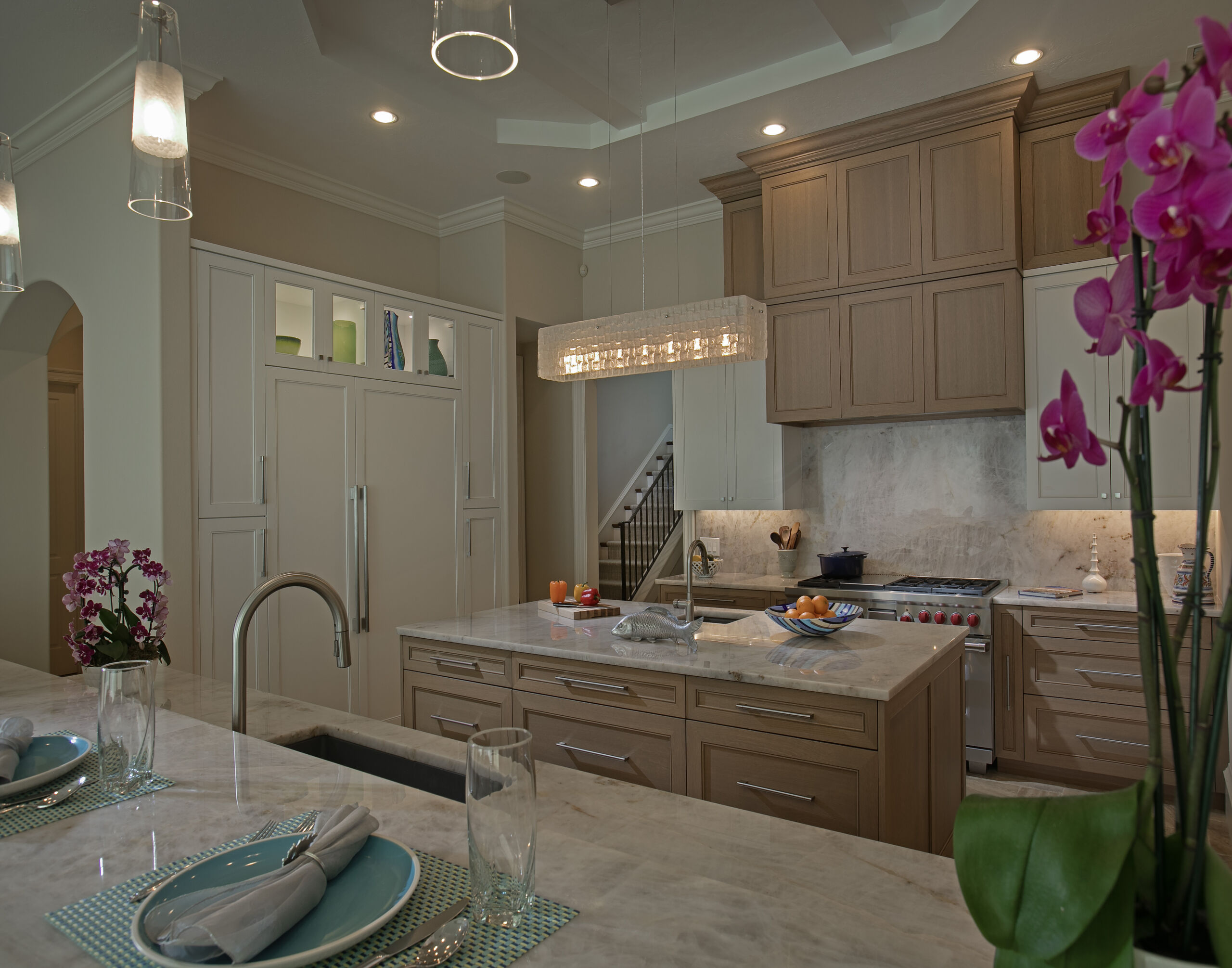 This Longboat Key home sits on Sarasota Bay. The view is awesome as is the cabinetry created by Artcraft Kitchens. The Interior Designer is Kristin Raybon Designs. The contractor is Anthony Girard Specialties. The Kitchen and Wet Bar have Thermador, Wolf and Fisher-Paykel appliances. The cabinetry features recessed panel doors and drawers in both “Pure White” paint and “Jordanwood” stain on Rift White Oak. The counter tops are “Cristallo” granite.
