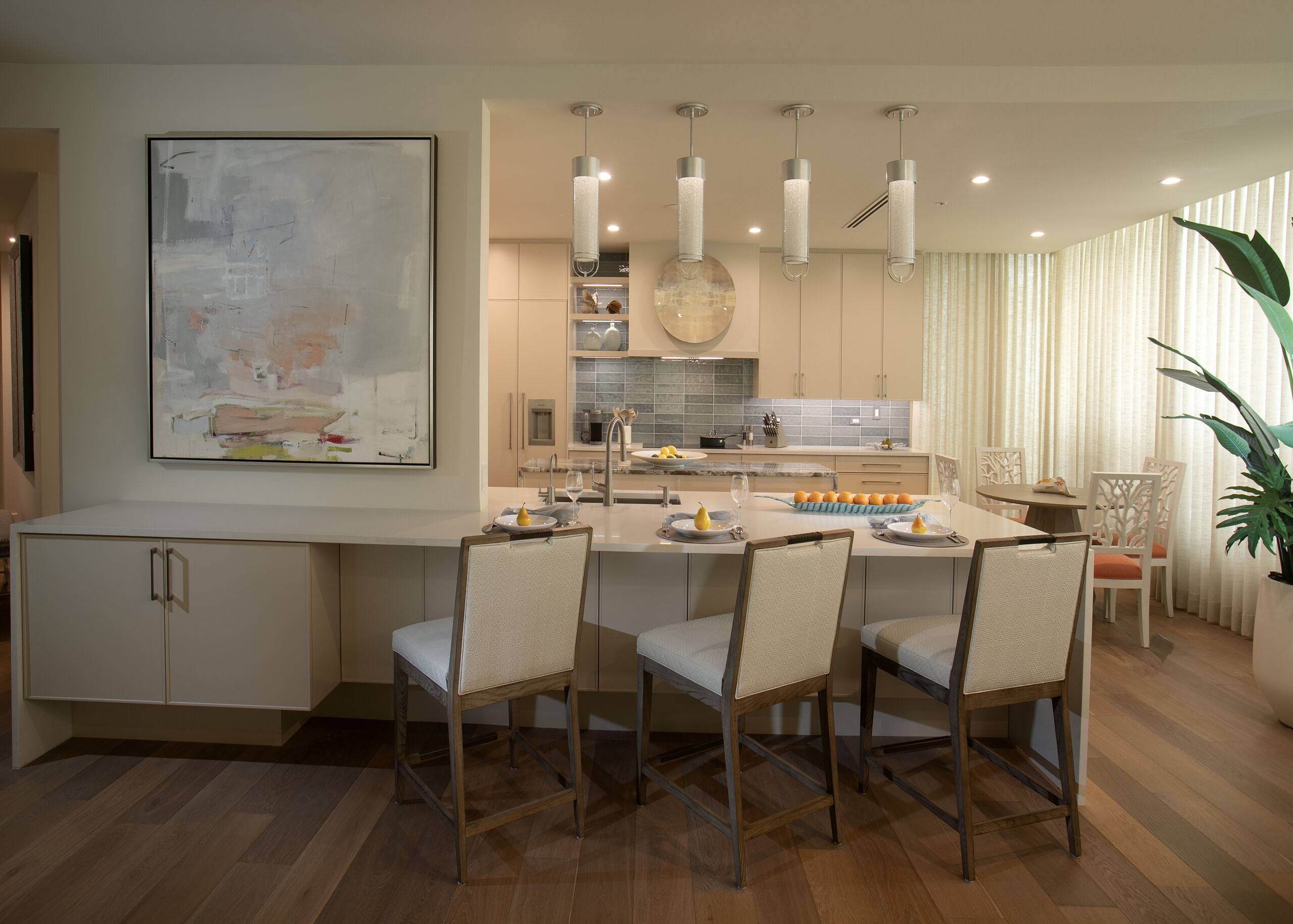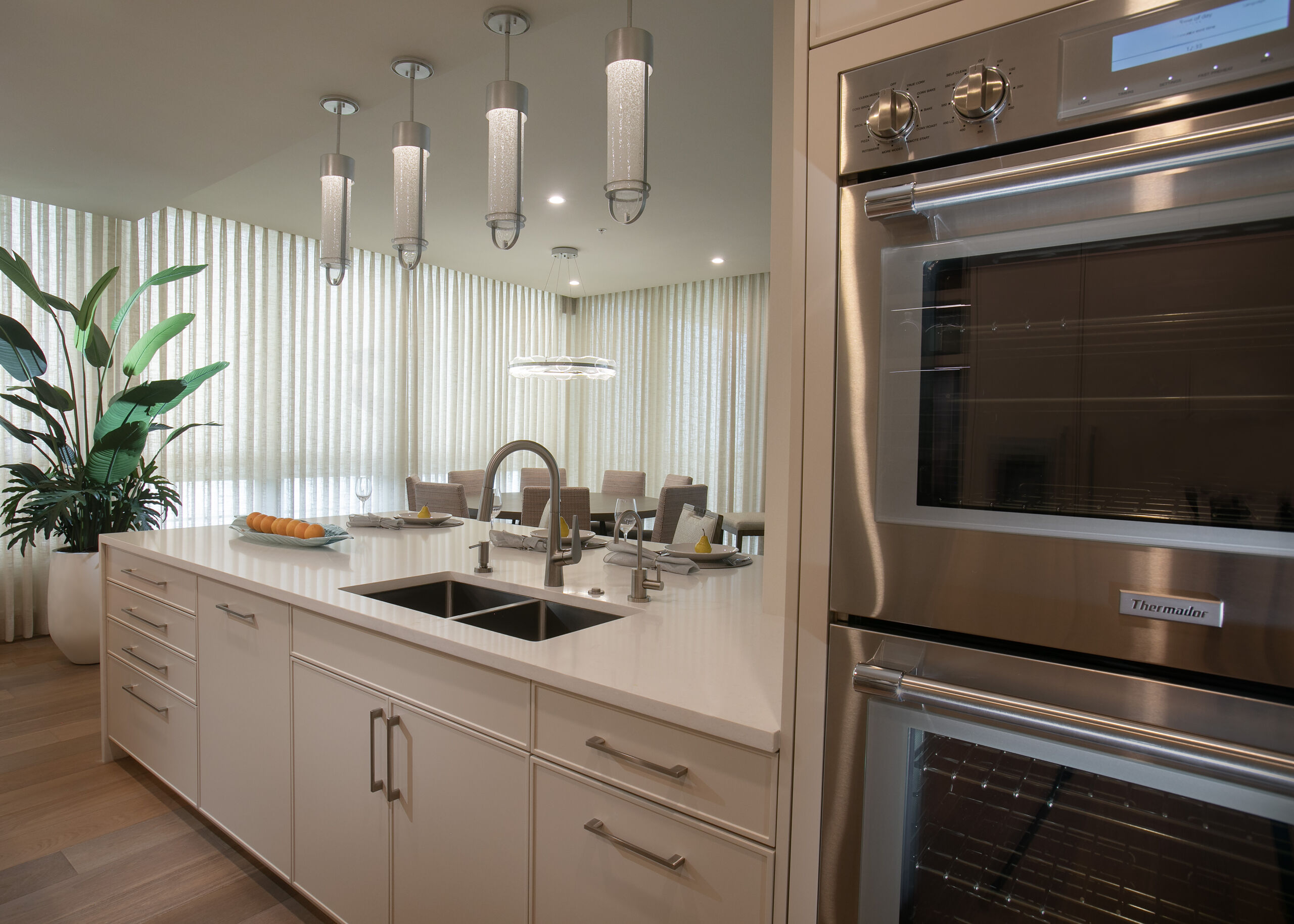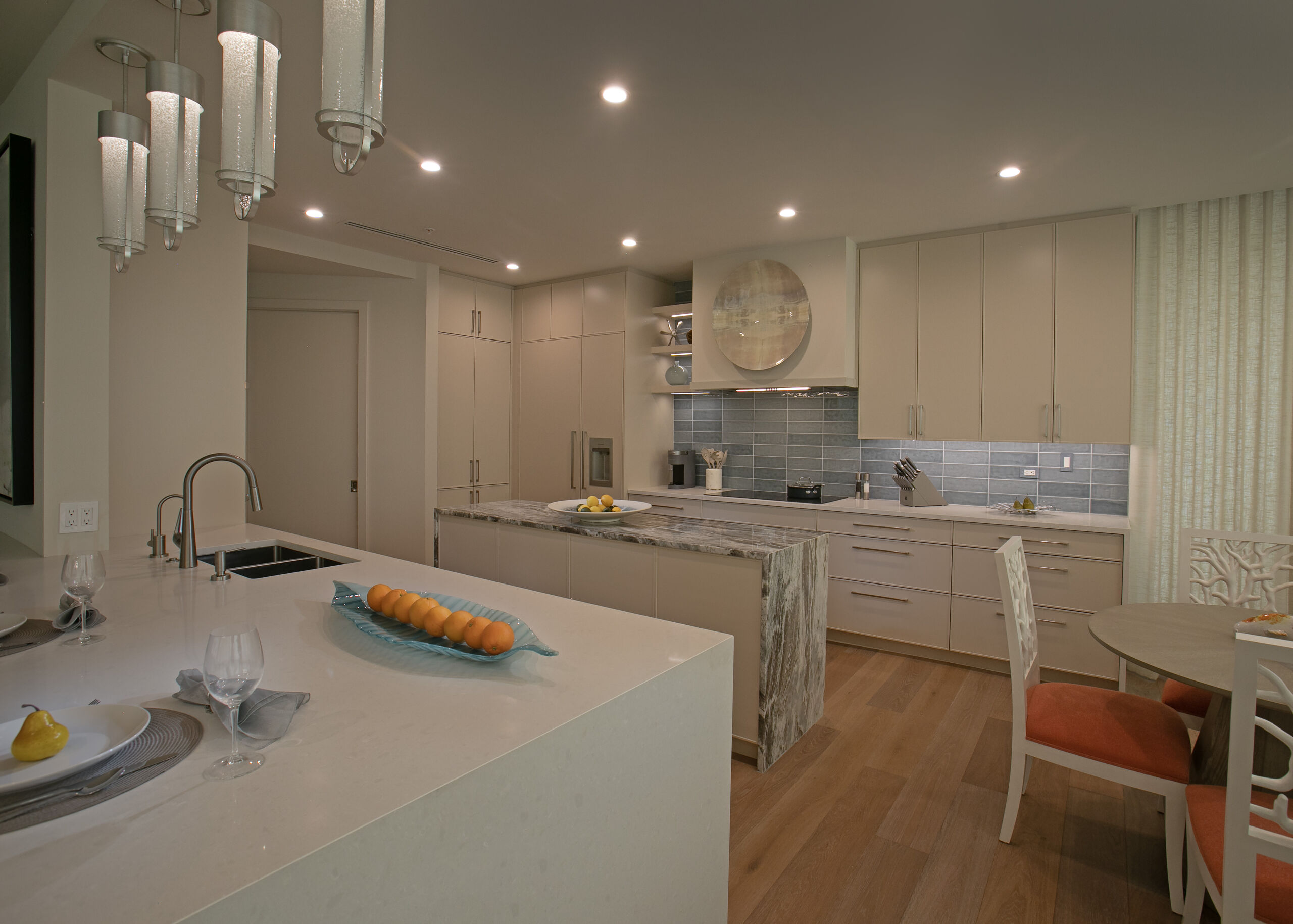 This condominium has views of both the Gulf and Sarasota Bay.  The appliances are Thermador and Bosch.  The Interior Designer is Sally Trout Interiors.  The cabinetry, provided by Artcraft Kitchens, is finished in “Accessible Beige” paint on a “Savoy 10” door and drawer style.  It is similar to a “Shaker” style, but with a smaller (10 mm) frame.  The cabinet interiors are in “Riviera Maple” with silver Vianaro drawer systems.